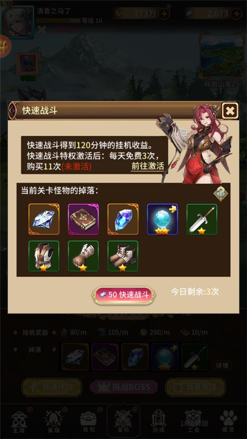 在冒险副本中,玩家能够看见这个按钮。每天玩家拥有3次快速作战的机会,每次快速作战需消耗一定数量的钻石。但好处是,通过快速作战可以掉落大量用于升级的经验以及装备。