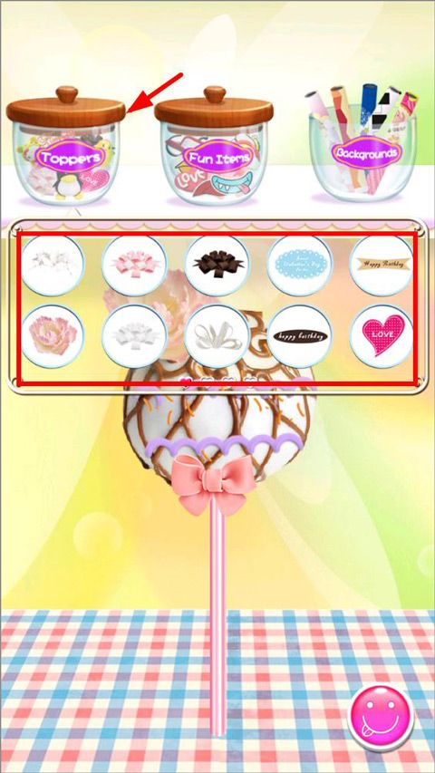 9、至此,棒棒糖蛋糕的基础部分已制作完成。然而,这仅仅是个开始,玩家若想让蛋糕更具特色,还能为其增添额外元素。只需点击选择不同的蛋糕装饰,就能打造出超级漂亮精美的蛋糕棒棒糖。
