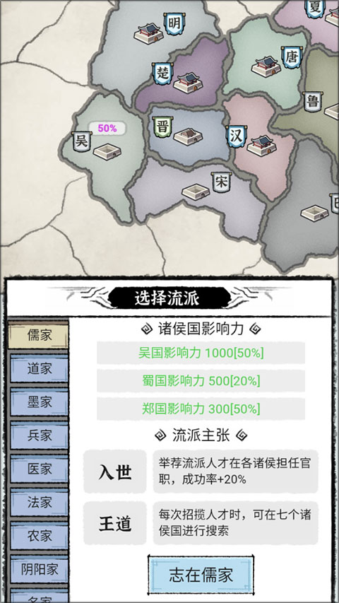 1. 流派抉择 — 百家学派各具专长,对各方势力的影响力也不尽相同。你能够自由挑选心仪的流派,开启管理之旅,践行自己独特的信念。
