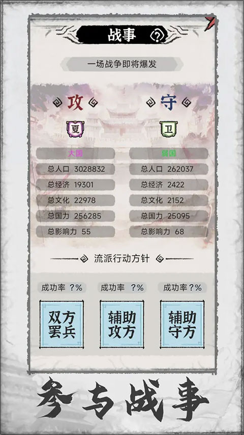 4、投身战事 — 谁说书生不赴沙场?在此,你能够凭借流派的影响力,投身于各方势力的战斗,以自身秉持的方针左右战事的发展走向。