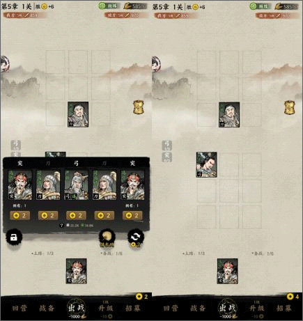 1、备战状态包含招募与上阵环节。当进入主线关卡后,只需点击界面中的【继续】按钮,就能开启关卡战斗。点击【继续】按钮后,便进入备战状态。在备战状态下,首先会弹出招募窗口(如图一所示),此时主公要依据自己所拥有的军饷(沙盒资源)数量,来招募相应的武将。
