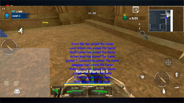 5、玩家可通过虚拟键盘操控角色移动,屏幕右下方设有按键,这些按键具备射击、换弹、半蹲、趴下等多种功能。
