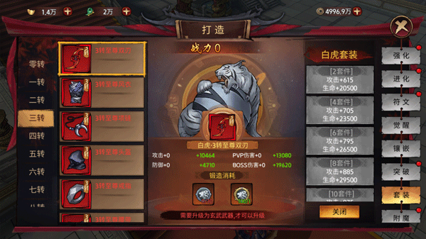 注意要二转以上的装备才能进行套装的锻造,每件装备都可以锻造4个套装属性,分别为青龙、白虎、玄武、朱雀。属性加成高低也是:青龙>白虎>玄武>朱雀。