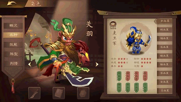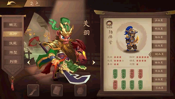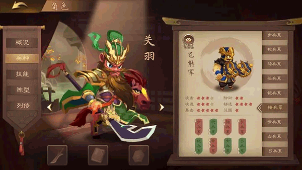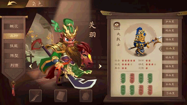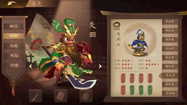 骑兵:机动力高,非常适合游击战术,灵活运用可对敌方武将形成包围,防御偏弱。