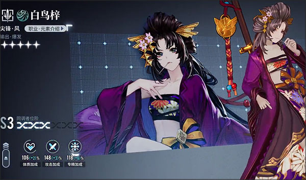 首先便是我们不少玩家较为熟悉的白鸟,作为后期原创角色,官方对角色的设定以及技能设计方面下了不少功夫,可以说是风系输出和爆发的代表。作为尖峰职业最具特色的角色,其单点爆发伤害能力相当高,且附带有对单攻击和对群攻击,多重技能方面的伤害加成,在输出方面无可挑剔。