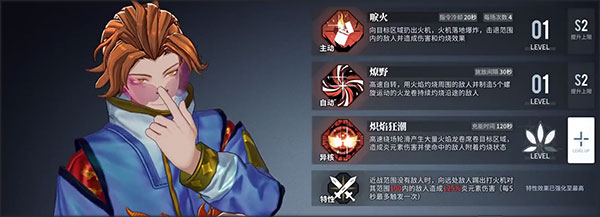 技能方面,一技能是范围型火属性伤害,并附带于五秒的灼伤能力。二技能则是以自身为半径,造成最多五名敌人的高额火属性伤害,并制造五个火龙卷,对沿途敌人造成再一次的火属性伤害。大招技能是大范围,高伤火属性伤害,并附带十秒的灼伤。注意,敌人被该角色大招灼烧之后,受到再一次火属性伤害时,暴击伤害会有所提升。