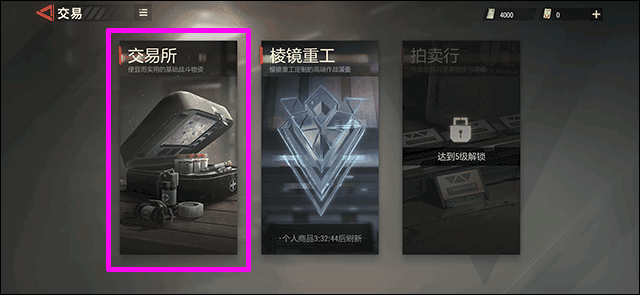 2、在交易界面找到并点击“交易所”功能选项,或者玩家也可以在升级到五级后开启