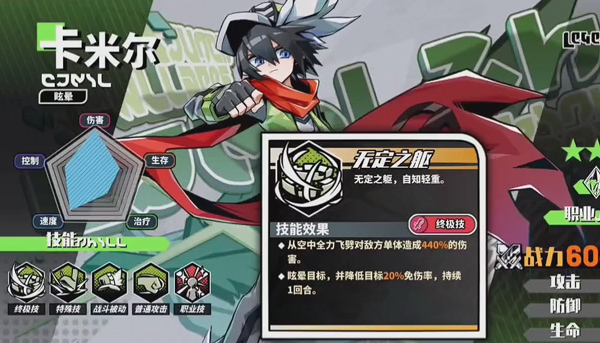 在技能层面,小卡的大招“无定之躯”相当强力,能对敌方单体打出400%以上的高倍率伤害。不仅如此,此技能还能100%眩晕目标一回合,同时降低目标20%的免伤率,为当回合后续队友的输出创造绝佳条件。