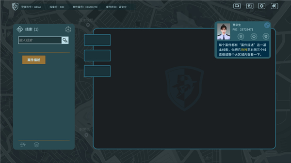 游戏系统里的案件,均源自炽城真实发生过的事件,且以关键线索的形式储存。每条线索都涵盖与之相关的信息,你得通过查看这些信息,持续发掘新线索,在脑海中将碎片化的线索拼凑成完整案件,并推理出案件的发生过程。玩家在此处,只要答对系统中有关案件的问题,就算完成一个案件。而且在完成案件后,还能查看罪犯的“犯罪陈述”。