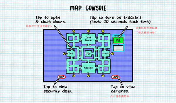 注意:在地图上,每次仅能关闭三扇门。房门每次关闭时长仅为10秒!追踪器设备每次工作时长也仅为10秒!