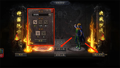 3、在人物选择界面,选择“创建人物”,设置好“姓名”、“职业”和“性别”后,选择“进入游戏”,小号就建好了,