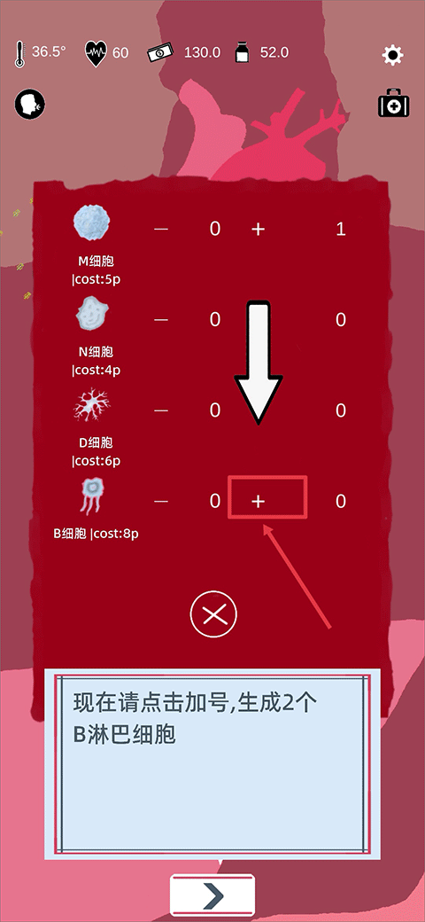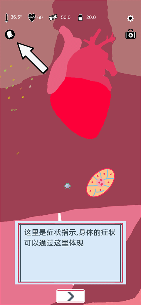 1、首先了解一下游戏的基本功能,左上角分别人体温、心跳、财富、和蛋白质