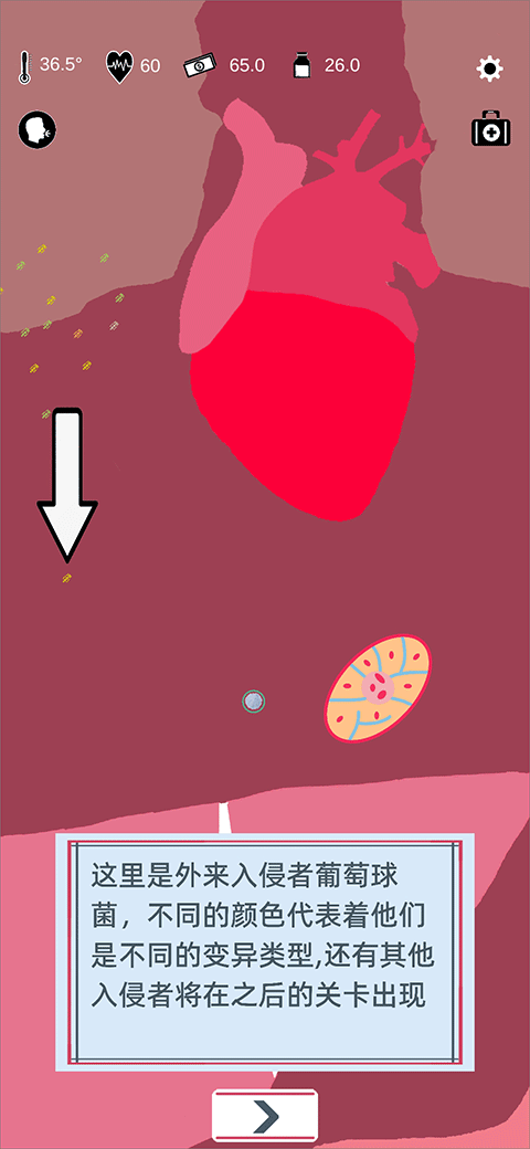 6、图中的小点点,正是入侵者葡萄球菌,不同的颜色意味着不同的变异类型,后续关卡中还会出现更多的入侵者。