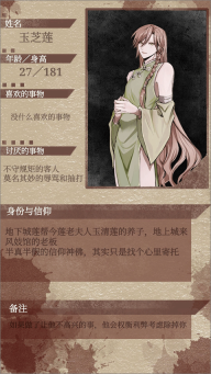 讨厌的事物:玉芝莲,自己的养父,卢氏