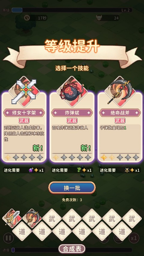 与《吸血鬼幸存者》类似的超武进化,能在“合成表”里查看。相较而言,这款游戏的出现点更为容易。