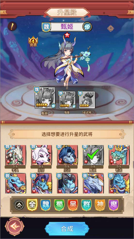 七星进阶到八星:需同阵营五星武将四个以及同阵营六星武将两个