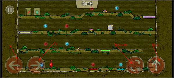 3、基本操作参照下图,你要操控游戏里的两个角色,通过相互配合来攻克所有难题。收集齐全部宝石,抵达大门就能取得胜利。