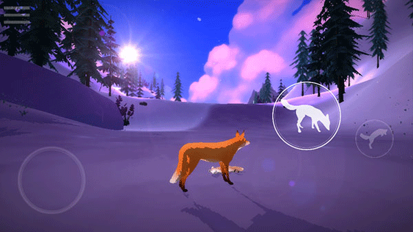 2、操作极为简便,通过左侧的隐形轮盘可操控狐狸移动,右侧则能实现互动、跳跃以及移动镜头的操作,完成相关操作后点击继续。