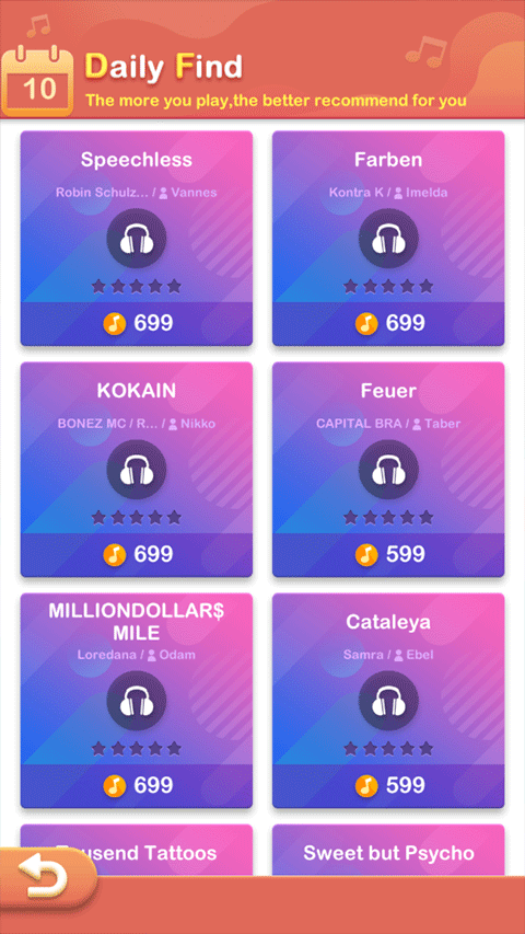 3、在主页点击“daily find”,就能看到游戏依据你平时弹奏的歌曲,为你个性化推荐的同类型歌曲。