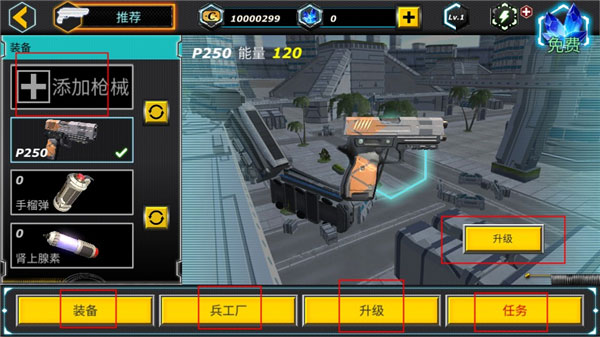 8、玩家可以选择添加不同的武器装备,还可以将自己的装备进行升级。