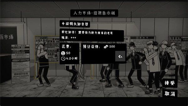 2、玩家需前往游戏里的人力市场,承接各类“打工”小游戏。这些“打工”小游戏在耗时、难度以及给予的报酬方面均有所差异,因此玩家得仔细挑选。要是去晚了,人力市场可就没有优质的“日结”工作咯!