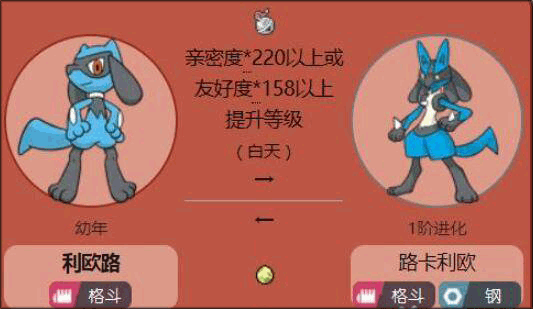 我们得努力与利欧路建立良好关系,提高亲密度。待亲密度达标后,让利欧路在白天升级,它就能进化为路卡利欧。