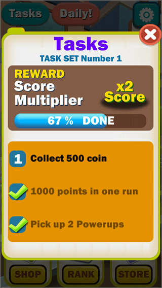 除了跑酷和收集金币这些基础玩法,游戏中更有意思的当属任务系统,其中包含多种不同类型的任务,下面我们就来逐个介绍。