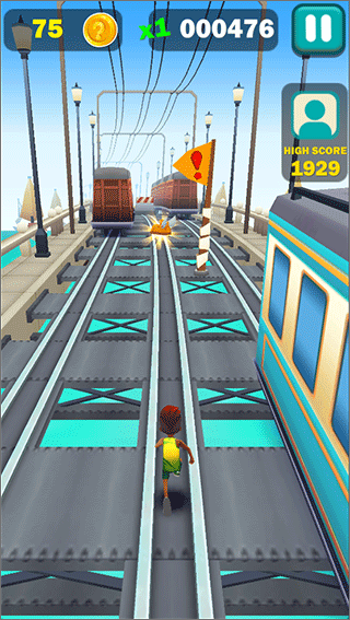 目标是尽可能跑的远,同时还要尽可能多的收集铁轨上的金币,游戏的视角是面向角色前进的方向。