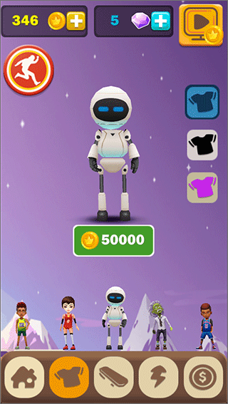 当穿过金币时,金币会自动被收集。拥有金币后,我们能够购买新角色,同时也能够为角色购置道具以及对道具进行升级。