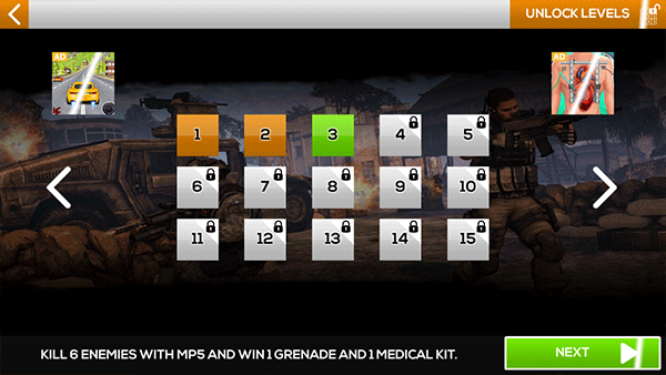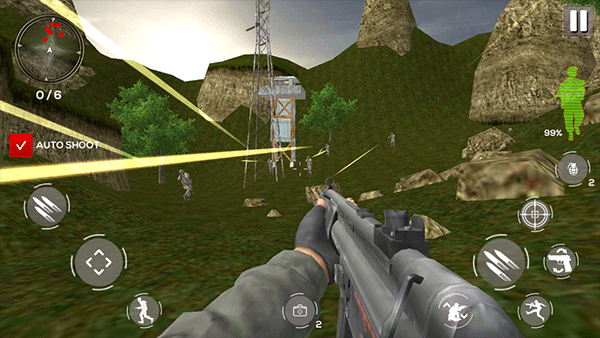 游戏内设有大量关卡,等待玩家前来挑战。每个关卡都匹配独特的地形地图,玩家能够逐个解锁并尽情体验。战斗时,玩家将采用第一人称视角,借助手中武器与地形优势,轻松战胜敌人。当把当前关卡的所有敌人消灭殆尽,便可进入下一关,游戏过程刺激又有趣。