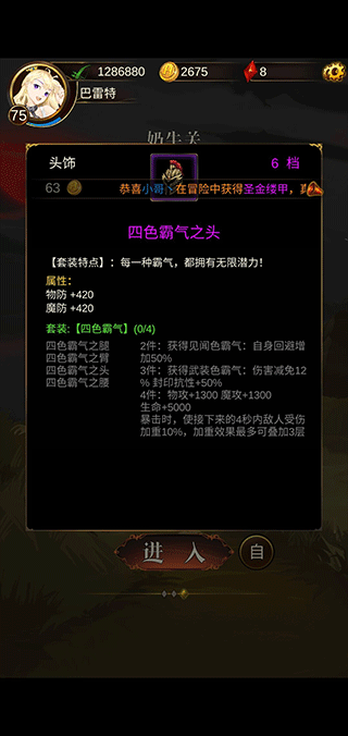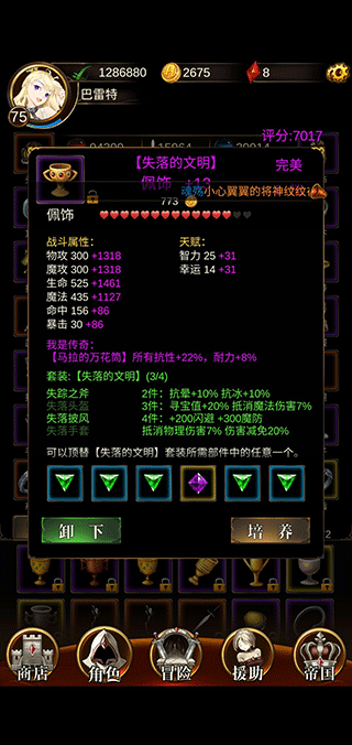 2、在前期推图过程中,大部分人都会在火凤凰这一关卡受阻。此时,要是你身上配备血乌和末日这两套装备,其他装备只要随意搭配并强化到12 + 8,便能够轻松碾压过关。成功通过火凤凰关卡后,差不多就可以着手刷失落的文明套装了。
