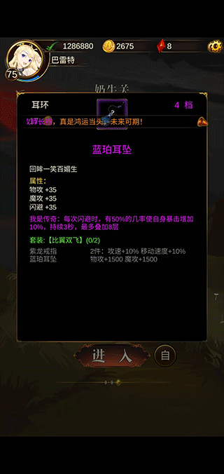 7、前期装备大致如此。到了后期,若拥有四色霸气和无远弗届,便可将伯爵套替换掉。当你获得免伤盾后,未来套也能换掉,仅佩戴戒指。耳环选择比翼双飞或者灵魂燃烧皆可。后期血量达到十几二十万,免伤有八九十的时候,还能搭配飘套,要是对面闪避,你就能持续回血。到那时,你宛如boss,怪物根本无法对你造成有效伤害,基本处于无敌状态。