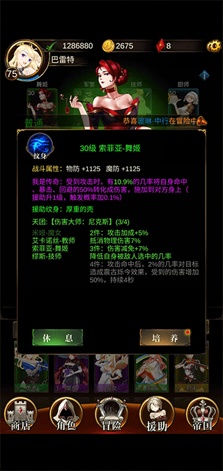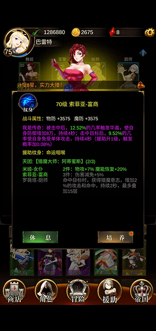 8、接着谈谈援助,其中最为关键的援助角色是索菲亚。拥有她就很不错了,要是追求极致,可以弄个紫色品质的。只有有了她,你才能在推图时挑战各种极限,感受那种刷脸带来的无敌体验。