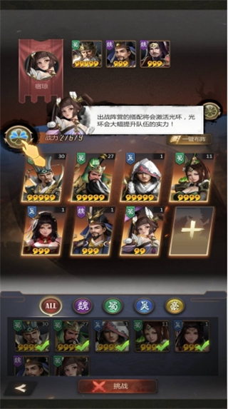 挑战为回合制,武将战力越高出手顺序越前,击败当前出战武将后,主公可再次出手攻击敌方出战武将,敌方全部阵亡后即为胜利。