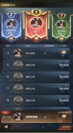 武神塔的排名,记录的是主公当下挑战成功所达到的最高层数。挑战获胜的层数越高,主公在榜单上的排名就越靠前。该榜单会呈现排名前一百的诸位豪杰。玩家若为排名靠前的玩家点赞,还能获取友情招募令,每天有三次点赞机会,累计下来总共可得到三个友情招募令。