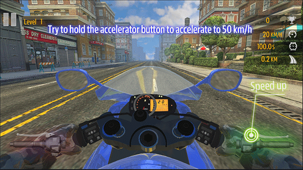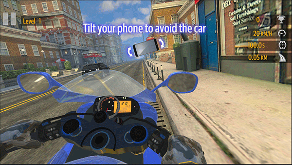 3、游戏中使用重力感应的方式来操控你的摩托,倾斜你的手机以左右转向避开汽车;