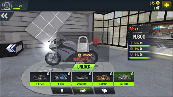 6、所获得的金币奖励可以用来解锁炫酷的摩托车或者升级摩托。
