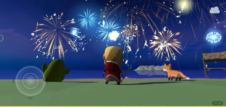 5、最后一个场景是放烟花,收集完烟花后,径直前往水晶门处放烟花,烟花似乎是循环不间断地燃放(右上角的云朵可用于退出游戏)