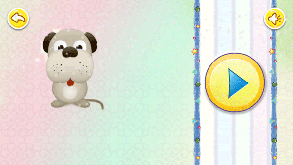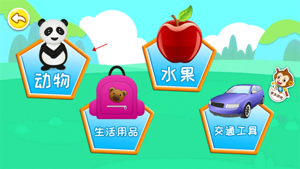 1、点击游戏界面正中央仅有的那个按钮,就会发现游戏划分为四个板块,分别是:动物、生活用品、水果以及交通工具。