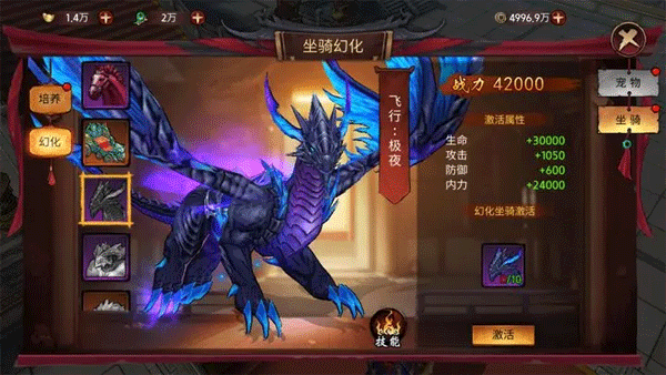 消耗对应的坐骑道具激活坐骑幻化,可使用独特的外观并获得被动技能、特殊属性加成。