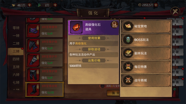 强化装备需要消耗强化石,提升一定等级后还需要高级强化石,通过一些副本和战令兑换就能获得,这边推荐秘宝禁地和BOSS玩法,除了能获得强化石,还可以得到大量经验和极品装备可谓是一举两得。