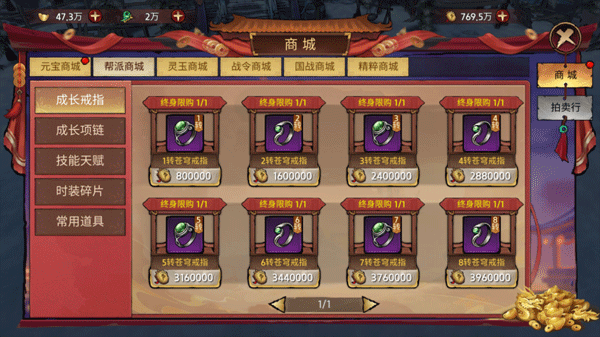 首先是我们的成长装备,成长戒指和成长项链,除了通过秘宝禁地刷元宝去商城购买,帮派商城也可以通过声望值进行兑换。