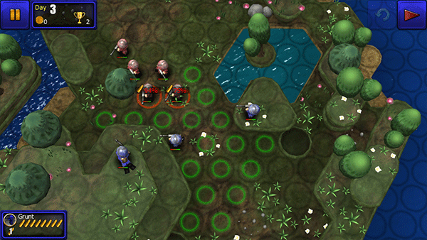 依旧得借助高地优势,让高地上的步兵攻击3格外的敌兵,接着让平地上的步兵上前将敌兵击毙。最后集结2、3个工程兵跟在步兵身后一同冲上去,4 - 6回合基本就够了。但这关要是到了Ridiculous级别,情况就大不一样了,因为敌方收入过高,每回合能刷出4个步兵甚至1个狙击手,难度瞬间飙升,根本没办法在8回合内完成任务。所以只能先进行防守,积攒步兵数量,并且尽快把2到3个步兵升一级。步兵升一级后攻击力增强,能够一枪毙敌。此时再攒3、4个工程兵,一起冲上去。从这关起,有个技巧需要掌握,那就是Hit and Run。点击敌兵,画面会呈现敌兵的移动范围以及移动后可达到的攻击范围(绿圈和红圈),在消灭前方敌兵后,要是机动力足够,一定要撤到后方敌兵的攻击范围之外。工程兵同样要留意,别进入敌兵的火力圈。