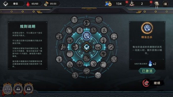 每局游戏的天赋盘,均由一半随机职业天赋和一半通用天赋构成。僧侣对天赋的需求不算高,在游戏开始前,刷出通用天赋“精准击杀”即可,该天赋对四个职业都颇为重要,能让你实现无限出牌的操作。不过,也有几个职业天赋对通关助力极大,在此简单给大家介绍一下,要是碰到了,尽量点选。