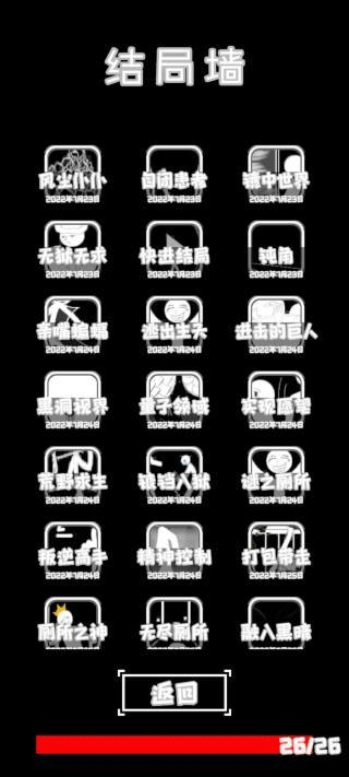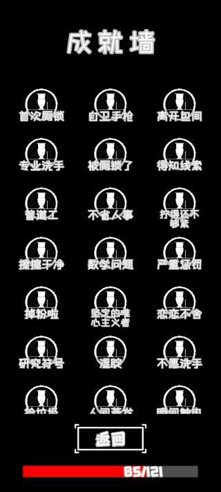 在口袋里找找纸,翻一下上衣口袋,接着查看左侧隔板,先敲一下隔板,随后决定不敲了,转而朝着隔板下方的缝隙里看一眼,然后伸手去抽一张纸(要是持续抽取的话,可以得到10张纸,点击物品栏,用卫生纸擦PP)。此时不想出去(解锁成就:恋恋不舍),选择再等一会儿(一直选等待这个选项),最终结局是:自闭患者