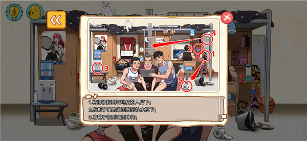 2、把潘周聃书桌右侧的“老坛酸菜泡面”拖到左侧饮水机处接水,这时中间的男生就会去吃泡面。
