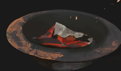 12、将刚刚获取的所有道具统统烧掉,接着爬上棺材以触发剧情,火盆之中有一张纸条,随后便进入尾声。
