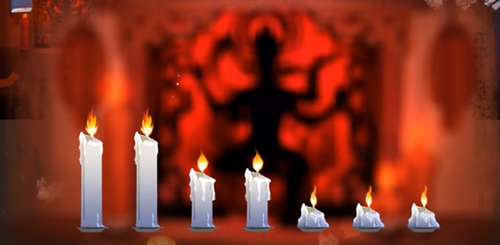 7、窗户上方有蜡烛,依据窗户上方的蜡烛解开神像蜡烛谜题,得到半截蜡烛。接着往右侧行进,转换场景。