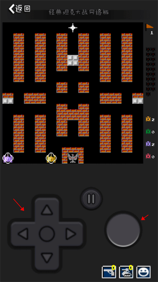 (2)玩家需按住左侧的上下左右方向键操控坦克移动,当敌方坦克对你的坦克发起攻击时,你要按住右侧的小圆圈发射炮弹抵御敌方坦克。