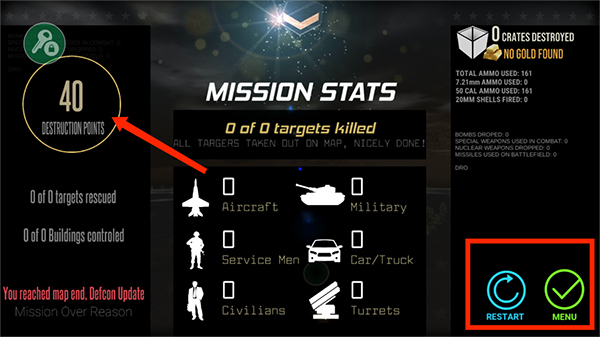 8、当完成任务后,玩家能够看到对应的结算分数以及所获得的奖励。此时,玩家既可以选择【RESTART】开启新的一局游戏,也能够选择【MENU】返回游戏大厅。以上便是核弹2这款游戏的玩法与攻略。